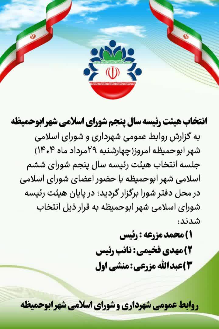 به گزارش روابط عمومی شهرداری و شورای اسلامی شهر ابوحمیظه امروز(چهارشنبه ۲۹مرداد ماه ۱۴۰۴) جلسه انتخاب هیئت رئیسه سال پنجم شورای ششم اسلامی شهر ابوحمیظه با حضور اعضای شورای اسلامی در محل دفتر شورا برگزار گردید؛ در پایان هیئت رئیسه شورای اسلامی شهر ابوحمیظه به قرار ذیل انتخاب شدند: ۱ ) محمد مزرعه : رئیس […]