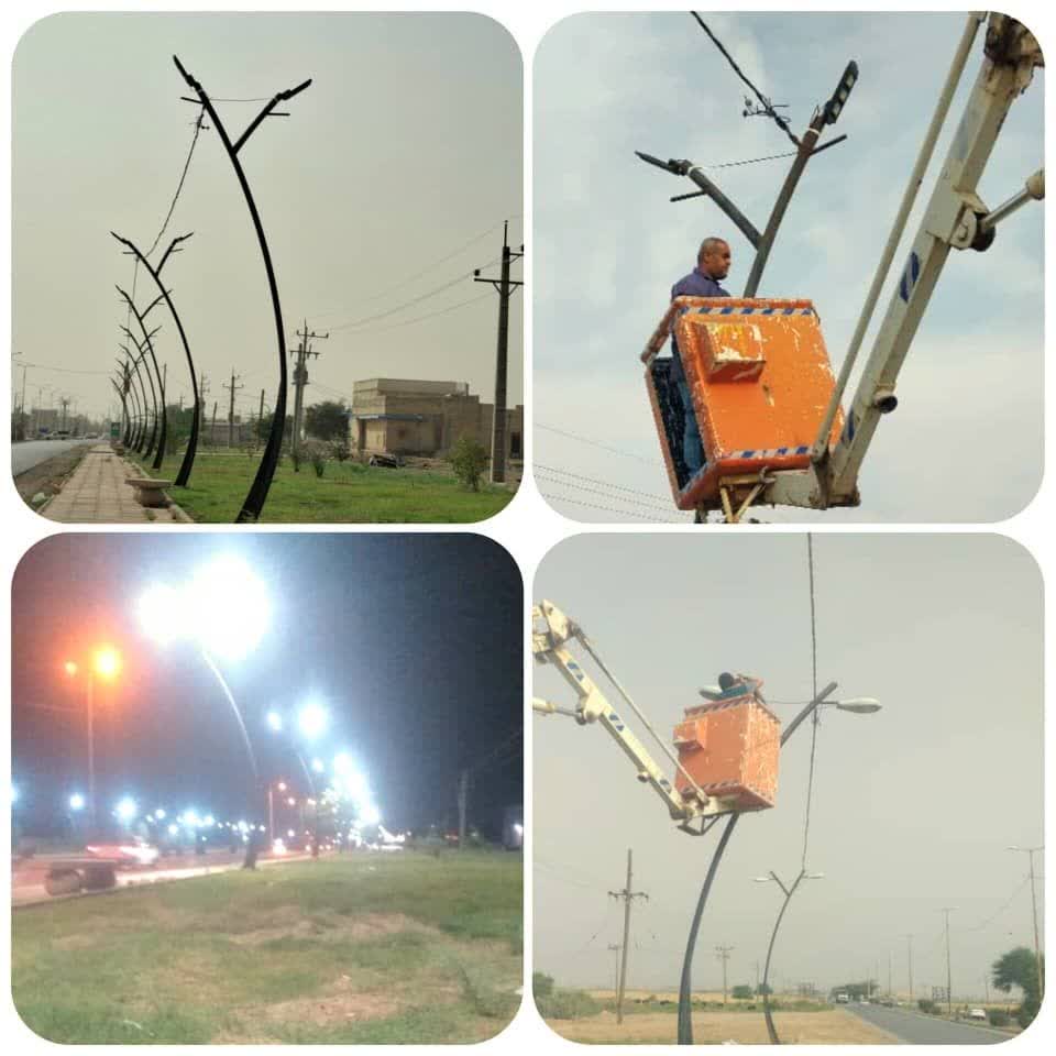 بازسازی نوار فضای سبز ورودی شهر تعویض چراغ ها و نصب لامپLED تیرک های روشنایی نوار فضای سبز (قسمت جنوبی) ورودی شهر ابوحمیظه از سمت سوسنگرد