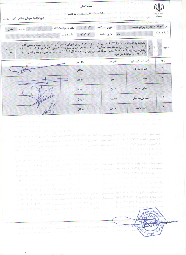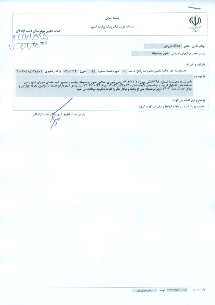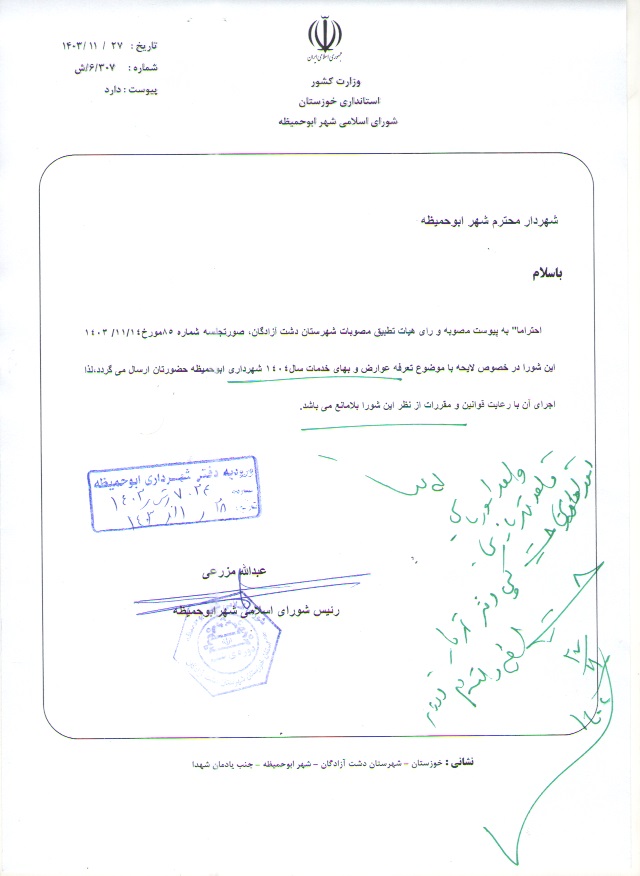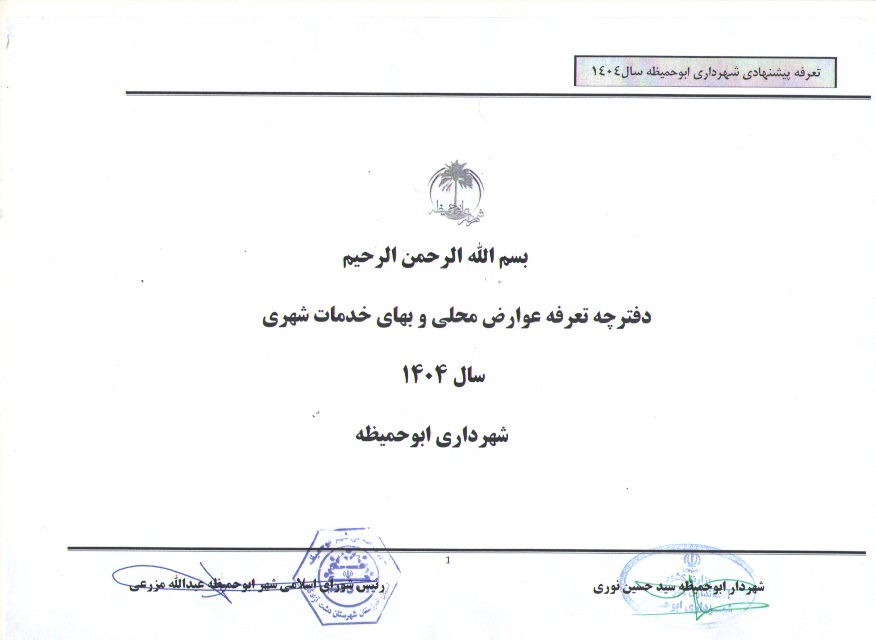 دفترچه تعرفه عوارض و بهای خدمات شهری سال ۱۴۰۴ شهرداری ابوحمیظه تصویب و ابلاغ شد