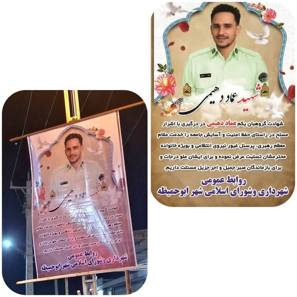 نصب بنر تسلیت شهید عماد دهیمی در سطح شهر توسط روابط عمومی شهرداری وشورای اسلامی شهرابوحمیظه