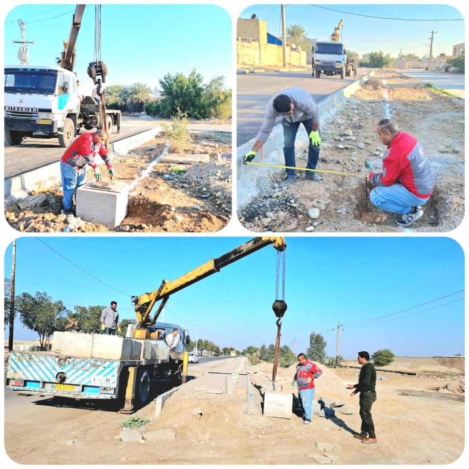 نصب فونداسیون تیرک های روشنایی در بلوار خیابان تعاون و ورودی شهر از سمت سوسنگرد توسط تاسیسات و واحد فنی شهرداری ابوحمیظه