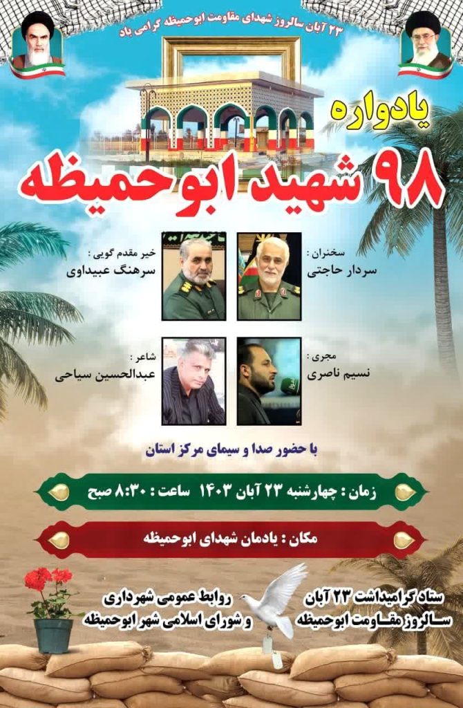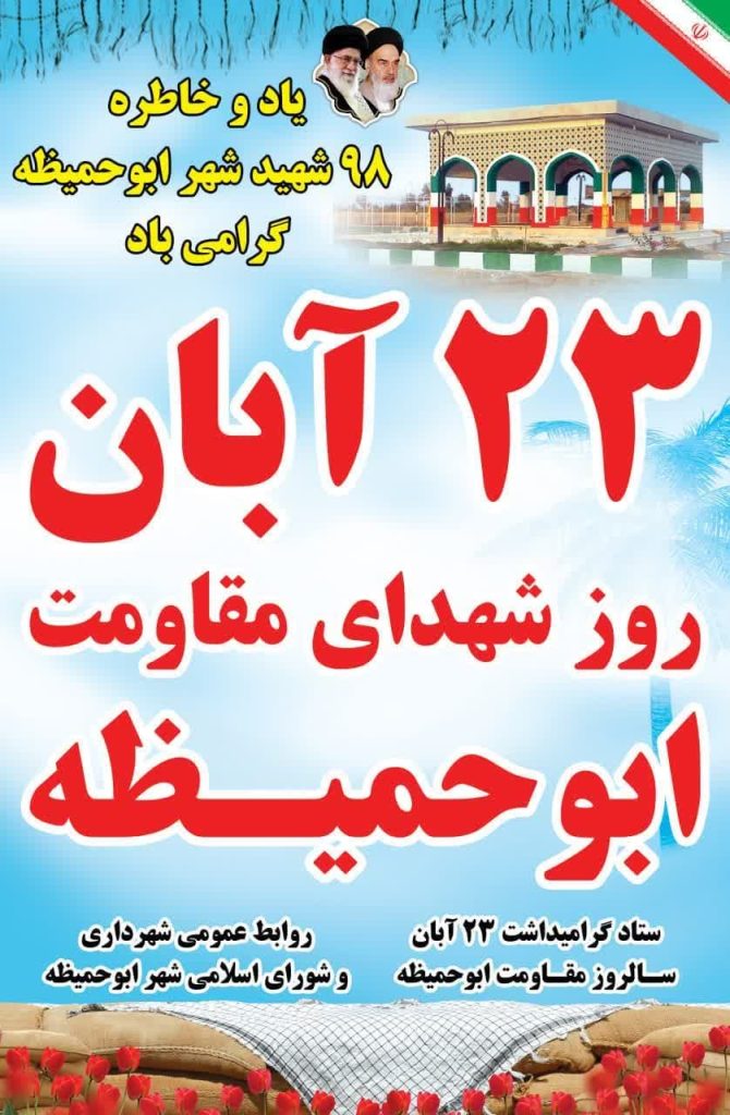 به گزارش واحد روابط عمومی شهرداری و شورای اسلامی شهر ابوحمیظه اولین یادواره ۹۸ شهید شهر ابوحمیظه با سخنرانی سردار میر عبدالرضا حاجتی مدیر کل حفظ آثار و نشر ارزشهای دفاع مقدس استان خوزستان، خیر مقدم گویی سرهنگ حاتم عبیداوی فرمانده ناحیه مقاومت بسیج شهرستان دشت آزادگان با حضور صدا و سیمای مرکز خوزستان در روز چهارشنبه ۲۳ آبان ۱۴۰۳ ساعت ۸:۳۰ در یادمان شهدای شهر ابوحمیظه برگزار می گردد.