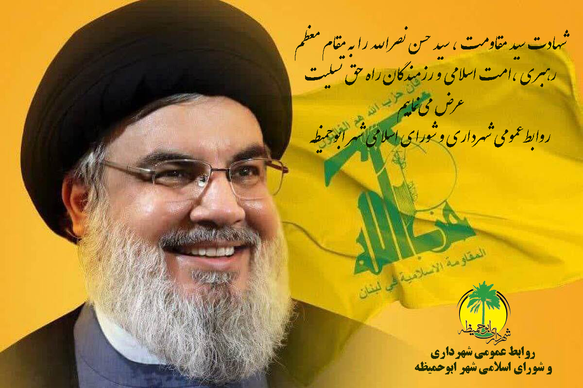 ضایعه دردناک شهادت سید مقاومت ،سید حسن نصرالله و جمعی از فرماندهان مقاومت را به مقام معظم رهبری ،امت اسلامی و رزمندگان راه حق تسلیت عرض مینماییم. شهید سید حسن نصر الله همواره سمبل مقاومت و ایستادگی در برابر زورگویان و ظالمان بود و نام ایشان همیشه در دل آزادی خواهان جهان باقی خواهد ماند.